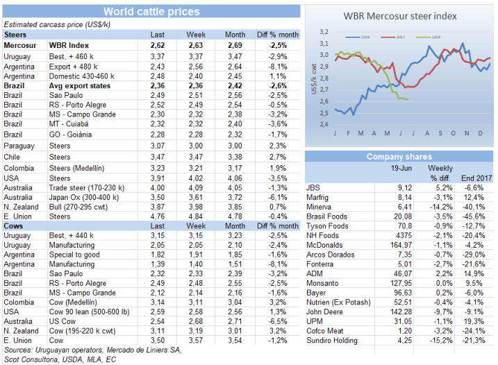 巴西市場育肥牛價格比較混亂,所有屠宰場都想壓價,但是活牛供應減少使某些州牛價反而開始上漲。跟往常一樣,本季活牛供應開始降低,同時國內(nèi)市場牛肉庫存也在減少,但消費市場也沒有什么需求,所以牛價近期上漲比較困難,圣保羅州牛價保持在140雷亞爾,與上周持平,已經(jīng)連續(xù)五周價格保持穩(wěn)定,但其他一些州牛價微漲。前文提到的對JBS腐敗調(diào)查可能會影響市場走勢,增加不確定因素。