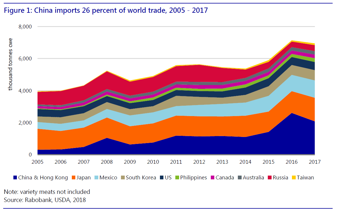 l 中國已成為豬肉和副產品出口最大對象國。其他亞洲國家的豬肉進口需求也在增長。豬肉進口產品除了低貨值種類還包括增值產品。