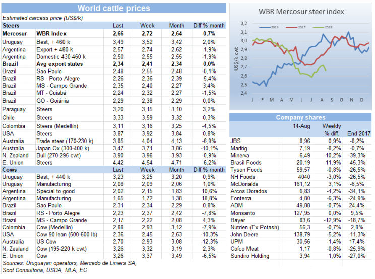 美國和土耳其的政治危機嚴重影響到了新興國家的貨幣,南方共同市場各國也受到了影響,本地閹牛均價被拉低。本周南方共同市場閹牛指數(shù)降低了6美分到2.66美金/公斤,近四周最低。前期由于本地牛價上漲以及貨幣貶值趨緩,美金牛價逐漸恢復,此趨勢被打破,阿根廷比索對美元貶值8.2%,巴西雷亞爾貶值3.6%。巴西本地育肥牛價漲到137.1雷亞爾,漲幅0.8雷亞爾,但換算成美元降低了7美分到2.34美金,阿根廷情況也一樣,出口閹牛價格漲了1比索,但由于貨幣貶值,美金價減少了17美分至2.57美金。烏拉圭牛價也顯示出降低趨勢,因為猶太團隊即將撤離,開始為481配額準備牛肉生產。本地區(qū)只有巴拉圭一個國家牛價上漲,漲了5美分。