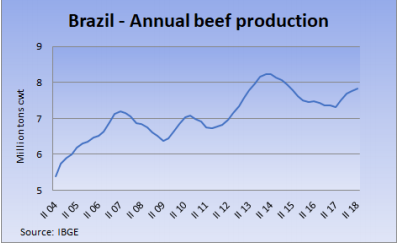 2018年至今,巴西增加了冷鮮牛肉對南美地區(qū)的出口量,從去年前7個月的2.6萬噸增加到6.1萬噸,增加了138%,巴拉圭不能出口智利增加了該市場對巴西產品的需求,而且巴西相對于其他國家牛肉價格較低,也提高了產品競爭力。