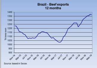 預(yù)計(jì)2019年阿根廷活牛存欄量會(huì)保持在5380萬頭,能繁母牛預(yù)計(jì)2360萬頭,比2018年略低,母牛屠宰量由于中國出價(jià)高而增加,新生牛犢數(shù)量將減少30萬頭。19年屠宰量將達(dá)到1330萬頭,比去年略低,如果由于飼草生長良好育肥牛壓欄,飼育場(chǎng)會(huì)推遲出售給屠宰廠。今年牛肉產(chǎn)量預(yù)計(jì)會(huì)達(dá)到300萬噸,與18年持平,待宰牛均重增加。由于阿根廷比索貶值帶來的利好,牛肉出口量預(yù)計(jì)會(huì)達(dá)到58.5萬噸,比18年多7.7萬噸(15%),比17年翻倍,從18年8月到19年1月,65%的牛肉出口去到中國和香港,10%去俄羅斯,10%去歐盟,5%去智利。