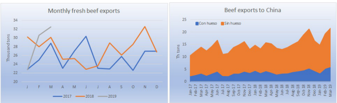 中國市場(chǎng)作為烏拉圭牛肉最主要的買家份額還在增長,三月份共進(jìn)口21511噸牛肉,占烏拉圭總出口量32458噸的66%,創(chuàng)下新的月度紀(jì)錄,中國采購了6071噸帶骨和15440噸去骨牛肉。第一季度帶骨牛肉銷售量漲了18%,而去骨牛肉漲了31%,均價(jià)也有增加,帶骨均價(jià)3246美金離岸價(jià),上漲9%,去骨牛肉4512美金離岸價(jià),上漲4%。北美市場(chǎng),主要是美國市場(chǎng)排名第二,第一季度共進(jìn)口12880噸牛肉,同比增長12%。三月份以色列市場(chǎng)排第三,進(jìn)口1071噸,但進(jìn)口量同比跌了68%。
