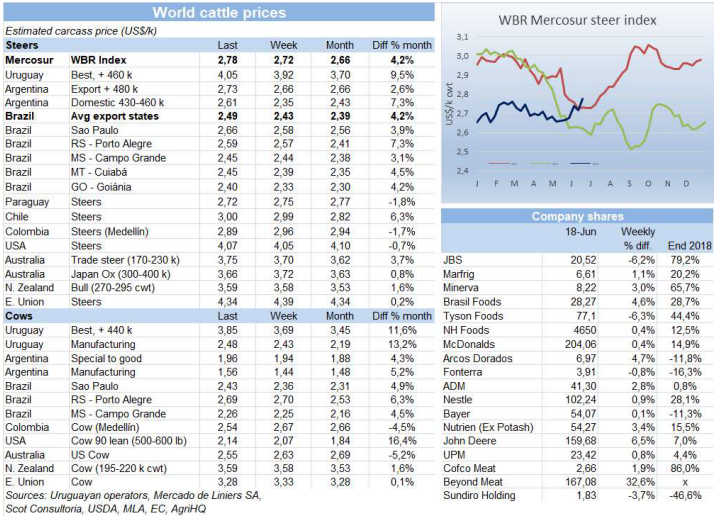活牛價格堅(jiān)挺、貨幣穩(wěn)定推高了南方共同市場閹牛價格,本周增長了6美分到2.78美金/公斤,達(dá)到2018年五月以來最高值。巴西重新可以出口中國之后,活牛價格上漲,把之前的跌幅全部漲回來了,主要出口州育肥閹牛價格漲了3雷亞爾/15公斤,達(dá)到140.5雷亞爾,換算成美金漲了6美分到2.49美金。烏拉圭牛價漲到4美金以上,自2011年以來第一次,阿根廷閹牛價格和上周一樣,但比索增值2.6%,美金牛價漲了7美分到2.73美金,只有巴拉圭牛價小幅下跌3美分到2.72美金。