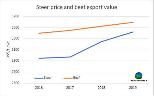 2017年國家肉類協(xié)會審查的16家工廠里有11家虧損,而現(xiàn)在的情況只會更糟,因?yàn)檎汲杀?span lang="EN-US">70-80%的活牛采購價格上漲的比牛肉銷售價格高出太多,2017年閹牛采購均價大約2970美金/噸,而平均出口價格為3452美金,差價約16%。2018年烏拉圭活牛市場由于更加缺牛,閹牛采購價格漲到3250美金/噸,而出口均價漲幅不大,因此差價縮小到9%。2019年至今牛價大幅上漲,閹牛采購均價漲到3420美金/噸,只比出口均價3593美金低不到5%。