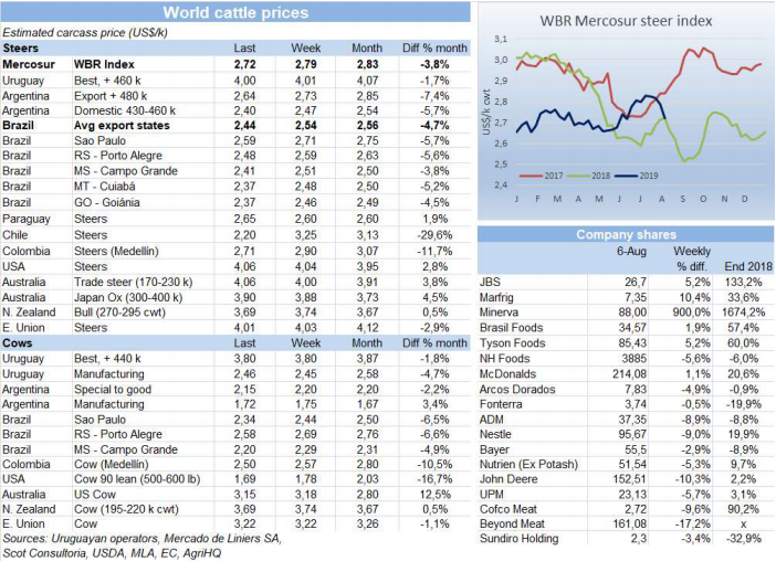 上周末起中美貿(mào)易戰(zhàn)重啟,對南方共同市場各國貨幣影響很大,拉低了閹牛平均價格,南方共同市場閹牛價格跌了7美分到2.72美金/公斤,近八周最低。人民幣貶值到近十年最低水平,影響到了其他國家的貨幣,比如南方共同市場國家,中國是其主要貿(mào)易往來對象,人民幣貶值意味著進(jìn)口商購買力削弱。雷亞爾貶值4.4%,比索貶值3.4%,雖然巴西和阿根廷本地牛價幾乎不變,美金牛價大跌,巴西育肥牛價格下跌10美分到2.44美金/公斤,阿根廷最好的出口閹牛跌了9美分到2.64美金,巴拉圭和烏拉圭牛價直接美金結(jié)算,沒有受到影響,巴拉圭牛價反而上漲5美分到2.62美金,烏拉圭牛價保持不變,還在4美金上下。