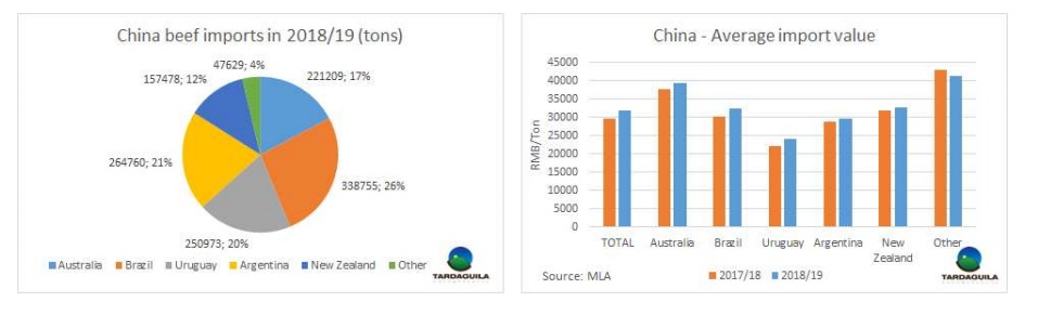 2018/19財(cái)年中國(guó)平均牛肉進(jìn)口價(jià)格31684元/噸,比2017/18財(cái)年增長(zhǎng)了7%,按美元計(jì),約4600美元/噸。主要出口商均提高了出口中國(guó)的價(jià)格,巴西和烏拉圭提價(jià)最多,約8%,巴拉圭仍然保持較低的平均出口價(jià)格(23999元/噸,約3488元/噸),或許因?yàn)閮r(jià)值較低的帶骨牛肉占比較大。提價(jià)最少的是阿根廷,約提價(jià)2%。澳大利亞也出口帶骨牛肉,比烏拉圭出口量少,澳大利亞出口中國(guó)的冷凍牛肉中帶骨牛肉占比11%,烏拉圭帶骨牛肉占比25%。出口中國(guó)平均價(jià)格最高的是澳大利亞,新西蘭位居其次。2018/19財(cái)年,巴西雖然授權(quán)的工廠數(shù)量很少,卻是中國(guó)冷鮮牛肉的主要供應(yīng)國(guó),中國(guó)從巴西進(jìn)口鮮牛肉33.9萬(wàn)噸,占進(jìn)口總量的26%,排在后面的是阿根廷(21%),烏拉圭(20%),澳大利亞(17%),新西蘭(12%)2018/19財(cái)年中國(guó)總進(jìn)口量128萬(wàn)噸,年增長(zhǎng)55%。