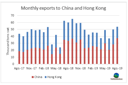 八月巴西對中國港口直接牛肉出口量達3,7292噸,創(chuàng)新紀錄。銷往香港牛肉量減少至1,6576噸,兩者總計5.4萬噸,是自2018年11月以來的最大。出口埃及1,8590噸,超過中國香港,本年度截至八月,累計出口至北非國家11.1萬噸,比去年同期增長12%。巴西對其他國家年度出口總量中的第四位是阿拉伯聯(lián)合酋長國,與2018年的5.1萬噸相比,其購買量增加了五倍以上。