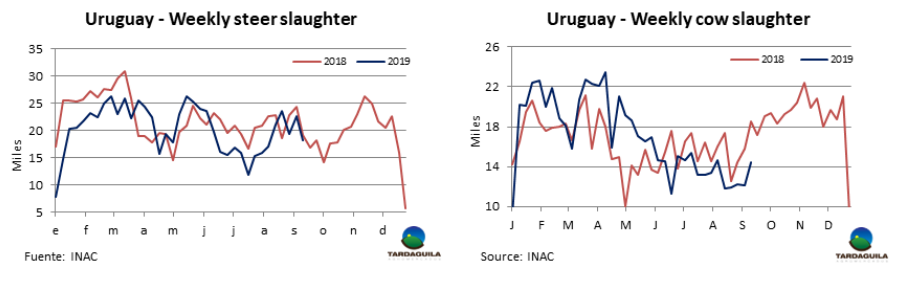 隨著481配額的最后一批貨將在10月1日到港,牛只屠宰量尤其是閹牛屠宰量下降。37周合格工廠共屠宰1440254頭牛,比上周減少42393頭,減少了5%,比去年同期減少6000多頭,本周閹牛屠宰量減少約4300頭,減少了19%,減少至18278頭,母牛屠宰量增長2300頭,增長至14463頭。屠宰量最大的廠是 Las Piedras (4,483頭), Marfrig-Tacuarembó (4,126頭) and Minerva-Canelones (4,047頭)。Marfrig三家工廠共屠宰9938頭,Minerva兩廠共屠宰6248頭。