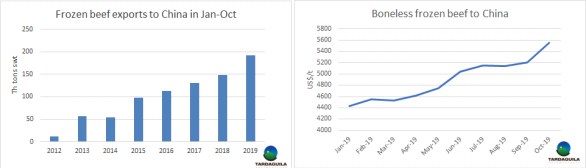 10月烏拉圭共出口冷凍牛肉24165噸,其中出口中國19941噸,約占總出口量的82.5%。上個(gè)月烏拉圭出口鮮牛肉26357噸,比九月出口量28882噸有所下降。出口量的減少由于季節(jié)性減產(chǎn)。中國擁有比其他出口目的地更高的價(jià)格,因此中國市場份額越來越高并不意外。10月中國冷凍牛肉采購價(jià)格平均5549美元/公斤,比1月采購價(jià)格上漲25%。今年前10個(gè)月,14.7萬噸冷凍去骨牛肉和4.6萬噸帶骨牛肉出口至中國去骨產(chǎn)品和帶骨產(chǎn)品出口量分別同比增長35%和16%。