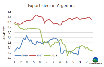 大選結(jié)果確定和貨幣兌換管控過后閹牛價(jià)格穩(wěn)定。英國純種閹牛報(bào)價(jià)140-145比索/公斤,印度串種閹牛報(bào)價(jià)136-140比索/公斤,母牛價(jià)格上漲趨勢受中國需求影響,價(jià)格上漲至優(yōu)種閹牛水平:特種和良種母牛報(bào)價(jià)140-145比索/公斤,工業(yè)母牛報(bào)價(jià)125-130比索/公斤。
