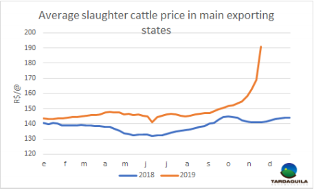 受巴西價格強勢增長影響,南方共同市場閹牛平均價格強勢增長,南方市場閹牛價格指數本周上漲20美分,上漲至至3.1美元/公斤,達到自2016年10月三年多以來最高水平。巴西直接出口中國的工廠增加,需求端對相對短缺的供應端做出反應,本周價格按雷亞爾計算增長了13%,按美元計算增長了12.4%,主要的出口州老公牛平均胴體價格3.03美元/公斤,一周內增長了34美分。阿根廷情況則不同,出口閹牛價格仍然保持10月末的水平,歐洲需求的減少對價格有一定影響。巴拉圭市場更加穩(wěn)定,胴體價格2.8美元/公斤,達到3月初至今最高。烏拉圭特種閹牛價格達歷史最高,胴體價格4.35美元/公斤,在接下來的幾天價格會趨于平緩。