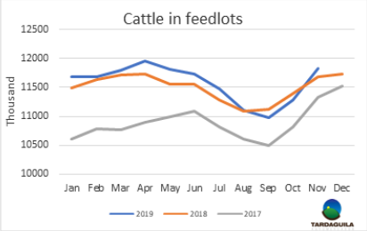 供應(yīng)少量增加,工廠專注2020年歐洲481配額牛肉生產(chǎn),活牛價(jià)格出現(xiàn)下行,期貨時(shí)間拉長(zhǎng)。中國(guó)市場(chǎng)的價(jià)格下行也對(duì)價(jià)格有一定影響。特種草飼閹牛胴體價(jià)格4.25-4.3美元/公斤,一些工廠出價(jià)4.2美元/公斤,目前沒(méi)有買到。成年母牛售價(jià)4.1美元/公斤,小母牛4.2美元/公斤。市場(chǎng)上昨天成交的期貨14-15天。上周熱浪來(lái)襲,巴西南部的一些地區(qū)產(chǎn)生了降水稀少的擔(dān)憂,北部地區(qū)最近有100毫米降水,南部大多數(shù)地區(qū)幾乎沒(méi)有降水。近幾周屠宰場(chǎng)將集中481配額牛只的屠宰,草飼牛需求較低,工廠已經(jīng)開(kāi)始采購(gòu)配額縮減后的牛只了。預(yù)計(jì)12月中旬市場(chǎng)價(jià)格將有下行趨勢(shì)。