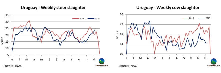 上周牛只屠宰量提高,一部分由于是歐洲481配額牛只生產(chǎn),還因為缺水的氣候狀況導(dǎo)致草飼牛供應(yīng)增長。烏拉圭肉協(xié)報道,截至12月7日的一周合規(guī)屠宰場屠宰牛只47124頭,比上一周增長1.2%,(增長540頭),創(chuàng)5月最后一周至今6個月以來新高。由于屠宰活動集中于1月1后下一季度481配額牛只生產(chǎn),閹牛和小母牛占大多數(shù),閹牛屠宰量24034頭,比上周增長2549頭,達(dá)5月25日以來周屠宰量最大。小母牛屠宰量比上周減少,但仍然很高(7767頭),母牛屠宰量減少1229頭,減少至14268頭。全球屠宰量與去年同期幾乎相同,但構(gòu)成卻大不相同:閹牛和小母牛屠宰量增長5000頭以上,母牛屠宰量減少5.4萬頭以上。屠宰量最大的三個工廠是Las Piedras(4020頭),NH-BPU(3986頭),Marfrig-Tacuarembo(3523頭)。Marfrig4家廠總屠宰量13155頭,屠宰量是2月中旬以來最大。Minerva2家廠屠宰量6762頭。