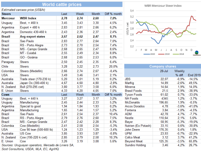 本周南美國家待宰牛價格上漲,上漲趨勢受到密切關注。南方共同市場閹牛價格指數(shù)上漲4美分,至2.78美元/公斤,達三月上半月新冠疫情在南美地區(qū)爆發(fā)以來新高。較五月中旬牛價低點時上漲了48美分,上漲了21%。巴西,按本地雷亞爾計的成交價再次上漲。本周美元在全國范圍內下跌,而巴西雷亞爾升值1.2%。巴西主要出口周育成牛價格上漲5美分,上漲至2.67美元/公斤。巴拉圭由于在口蹄疫接種階段活牛供應量少,價格保持上漲趨勢。阿根廷和烏拉圭活牛參考價本周上漲2美分,分別上漲至2.83美元/公斤和3.45美元/公斤。烏拉圭目前已經看到價格上漲趨勢將在本季度后停止。
