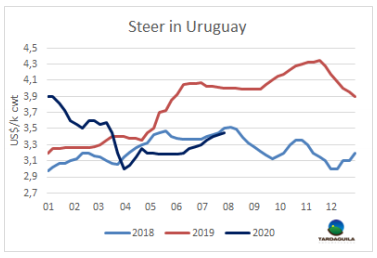 上周牛屠宰量增長超過6000頭,達六月末至今四周以來最高。烏拉圭肉協(xié)報道,截止7月25日的一周內,牛屠宰量37487頭,較上周增長了20%,同比增長了10%。周屠宰量最大種類是閹牛,閹牛屠宰量較上周增長了2821頭,增長至19364頭,母牛屠宰量的也有同水平的增長,增長了2895頭,增長至12664頭。屠宰量最大的工廠是Marfrig-Tacuarembó (5040頭),Athena-Pulsa(4949頭)和Las Piedras(3734頭)。Marfrig兩家工廠屠宰量8746頭,美麗華兩家工廠屠宰量7803頭。距月末僅余一周的時間,7月牛只屠宰總量124716頭,較2019年同期130375頭稍有減少。由于牛肉行業(yè)工會周二舉行了長達24小時的罷工,本周的屠宰活動可能會減少。