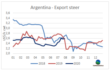 美國市場已成為阿根廷在中國市場低迷時期的補救措施:今年6月,阿根廷對美國胬肉銷售量達到2196噸,較5月增長308%,占美國年度總配額20000噸的10%以上。六月對美國出口的冰鮮牛肉平均價格6131美元/噸,冷凍牛肉平均價格4201美元/噸。因此,6月成為自2018年底恢復對美出口以來銷量最好的一個月。2020年至今,阿根廷已經向美國出口牛肉6440噸,出口額超3300萬美元。