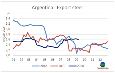 用于出口的牛價(jià)格已經(jīng)恢復(fù)了元?dú)猓贿^由于以色列假期和歐洲需求的下降,預(yù)計(jì)牛價(jià)將會(huì)下降。最好的英國(guó)純種閹牛成交價(jià)191-196比索/公斤,印度串種閹牛186-190比索/公斤,特優(yōu)種母牛158-163比索,工業(yè)母牛價(jià)格在136-143比索/公斤。