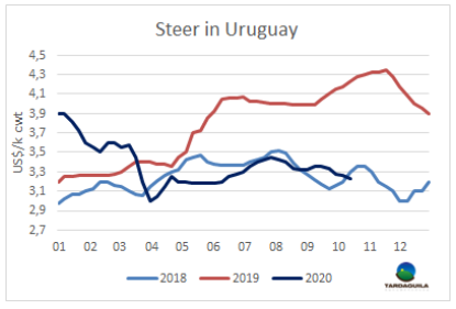 新冠肺炎在幾個歐洲城市的爆發(fā)以及重新實行禁令,給在假期旺季出口到歐洲的冷凍牛肉的生產(chǎn)帶來了不確定性。一些已經(jīng)為這一時期銷售生產(chǎn)完畢的阿根廷工廠不得不接受9000-9500美元/噸的價格,以減輕庫存。也有一些阿根廷工廠不愿以低于9500-10000美元/噸的價格成交。烏拉圭方面貿(mào)易商稱本周初最高成交價9000美元/噸,但這一價格是否能堅持仍取決于阿根廷的市場走向。一位貿(mào)易商總結(jié),目前的情況復雜,因為市場上有庫存,凍品很充足,沒有人愿意買。”預計自此之后屠宰量的季節(jié)性增長將導致臀腰肉的供應增加。