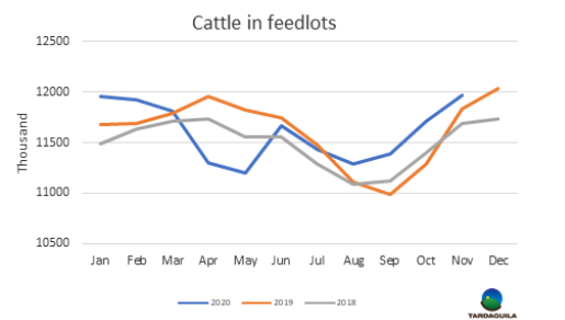 美國(guó)農(nóng)業(yè)部周五公布,2020年11月1日,美國(guó)千頭以上飼育場(chǎng)正在育肥的牛和牛犢存欄量達(dá)1200萬(wàn)頭,較2019年11月1日存欄水平增長(zhǎng)了1%。這是1996年開(kāi)始統(tǒng)計(jì)存欄以來(lái)11月存欄最高紀(jì)錄。1甌越補(bǔ)欄219萬(wàn)頭,較2019年10月下降了11%,10月共出欄187萬(wàn)頭,較2019年略有減少。
