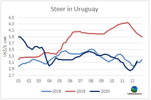 阿根廷牛價飆升,成為南美地區(qū)牛價最高的國家,這是自2017年至今三年來從未發(fā)生過的事情。本周育肥閹牛供應短缺再次推高價格。包含出口稅的美元價格3.39美元/公斤,較上周上漲了8美分。烏拉圭閹牛價格也由于供應短缺大幅上漲,本周成交價3.15美元/噸。恰恰相反,巴拉圭和巴西的牛價下行,本周巴西牛價按雷亞爾計下跌了5%,雷亞爾0.7%的升值部分抵消了雷亞爾價格的下行。巴西中央銀行表示,即將放棄將參考利率保持在最低水平的承諾,目前美元雷亞爾匯率為5.育成牛平均價格本周下跌了14美分至3.22美元/公斤。巴拉圭方面育成牛價格下跌至2.7美元/公斤。因此,南方共同市場閹牛價格指數(shù)下跌了5美分,下跌至3.2美元/公斤。
