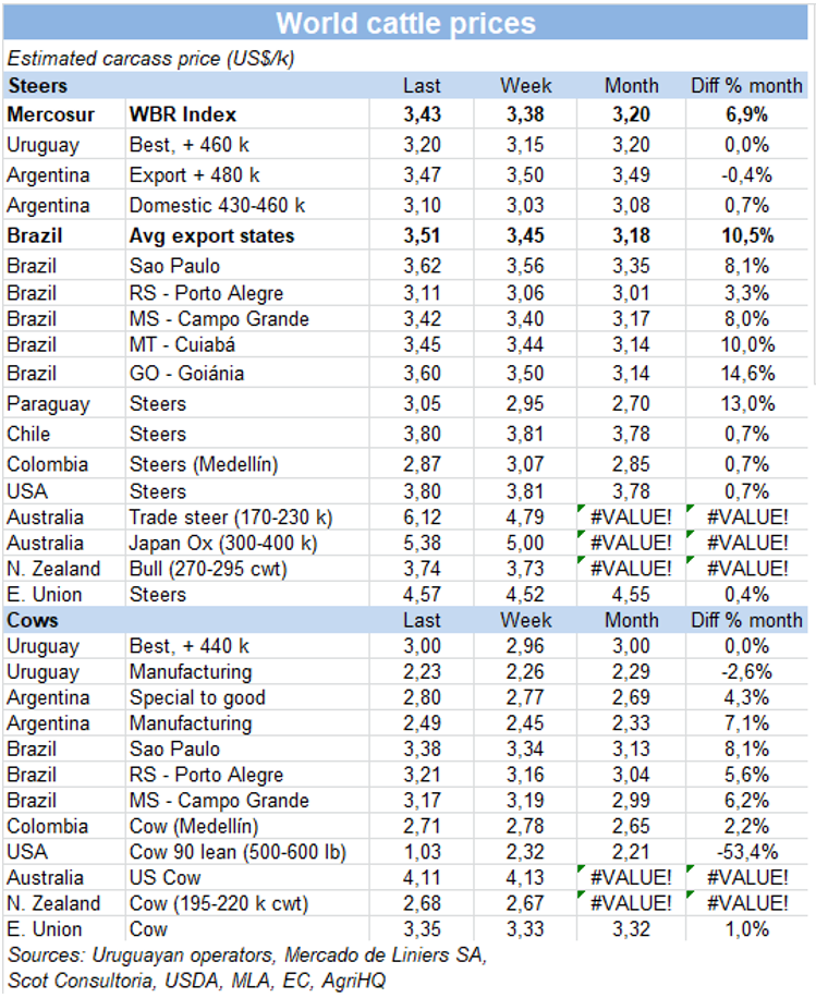 本周南美市場閹牛價格指數(shù)連續(xù)第五周上漲,本周上漲至3.43美元/公斤。巴拉圭、烏拉圭牛價堅挺,巴西方面盡管雷亞爾貶值,上周牛價也很堅挺。