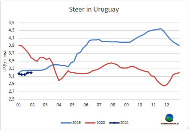 今年肉牛銷售額下降3.23億美元至18.63億美元,為過去四年的最低水平,下降了14.8%。以恒定比索計算,由于美元自去年3月以來的復(fù)蘇,降幅稍小一些,為7.2%。美元銷售額下降是由于活牛出口增加,待宰牛銷售量下降。待宰牛數(shù)量減少了22.5萬頭,至200萬頭。但肉類產(chǎn)量的降幅較小,只有7.5%,這是由于平均屠宰重量增加,因為閹牛屠宰量占比增加,且各類別的牛平均重量均有增加。2020年平均胴體重259.5 kg,年均增長7.2 kg(+2.9%)。平均價格下降了6.7%至872美元/頭。銷售量減少和平均價格下降使屠宰牛的銷售額減少3.36億美元(-16.1%)至17.5億美元?;钆3隹诜矫?,雖然貿(mào)易數(shù)量減少,但平均出口價格的增加(賣給中國用于繁殖目的的小母牛的比例很高)使出口額增加了大約1300萬美元,達(dá)1.13億美元。由于美元增值,按烏拉圭比索計價(生產(chǎn)商支付運費、人工費等),銷售額降幅較小。2020年平均1美元兌42比索,2019年1美元兌35.3比索,今年的通脹率達(dá)9.4%,因此按恒定比索計算,肉牛成交額下降了7.2%。