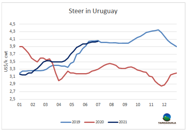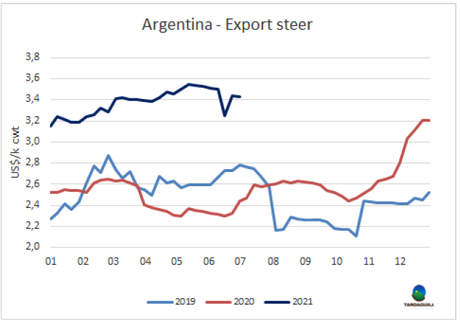 上周牛屠宰量再次增長,據(jù)烏拉圭肉協(xié)報告統(tǒng)計,截止6月26日的一周,屠宰量56395頭,較上周增長了8000頭,較去年同期增長了18000頭。這是今年屠宰量第三大的一周。盡管481配額的屠宰結(jié)束,燕麥飼養(yǎng)的牛出欄延期,但采購需求堅挺帶動屠宰量增長,所有種類的牛,無論好壞,都被買走了。本周屠宰量增長最大的是閹牛,本周增加了4301頭至25530頭(+20.3%),母牛屠宰量增加了3181頭至23214頭,小母牛屠宰量增加了457頭,至6250頭。屠宰量最大的工廠是Tacuarembo(4718頭),Ontilcor(4469頭),Las Piedras(4385頭)。Marfrig四家工廠屠宰總量14380頭, Athena三家工廠屠宰總量12164頭。據(jù)本月結(jié)束僅剩3個工作日,六月屠宰量已達208093頭,本月屠宰量將超過24萬頭,較2020年六月約增長7萬頭,是6月屠宰量第三大的年份,僅次于2006年和2007年。今年前半年牛屠宰量將達124萬頭,較去年增長了29.1萬頭,增長了31%。