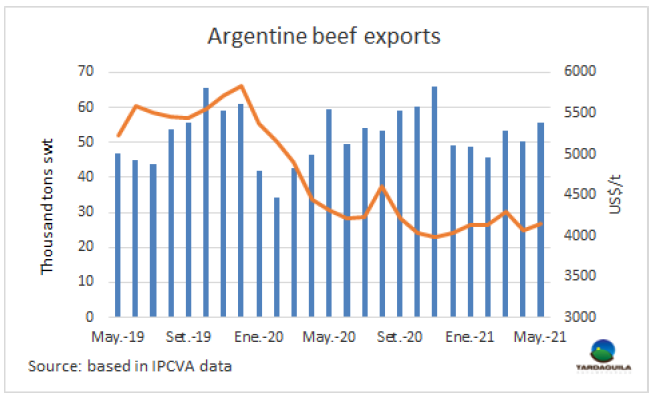 盡管政府在5月20日實行出口禁令,而且生產(chǎn)商暫停了9天的活牛銷售,5月的牛肉出口量是今年以來最高的,包括對中國的出口量。根據(jù)阿根廷牛肉促進研究所(IPCVA)的一份報告,牛肉出口量達55742噸 (約7.8萬胴體重量當量),出口額約2.315億美元(不包括內(nèi)臟)。也就是說,與4月相比,出口量和出口額分別增長了11%和13%,是2021年迄今為止最大。與去年相比,出口量同比下降了6.6%,由于國際市場價格下降,出口額下降了10%。與政策相反的出口表現(xiàn)主要原因是5月17日阿根廷總統(tǒng)宣布限制牛肉出口,該措施于5月20日開始生效,肉類工廠借此機會盡可能多的申請到所有的出口許可證,由于國際價格較好,在此之前已經(jīng)登記了大量的貨物。盡管農(nóng)業(yè)生產(chǎn)者發(fā)起了為期9天的罷工,肉類工廠和屠宰場仍在屠宰和加工已有的活牛。因此, 5月的屠宰量僅下降了11.7%。五月的平均出口離岸價約7400美元/噸,同比下降了3.7%,較4月增長了2%。