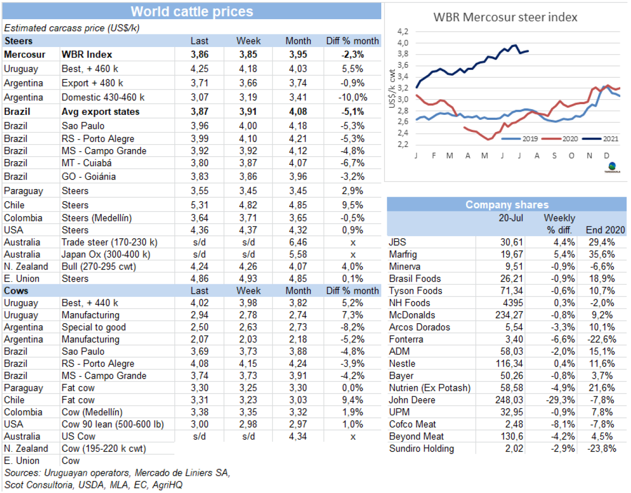 6月閹牛類型價值1261美元/頭,較上月增長了65美元,達2020年1月至今17個月以來的最高。烏拉圭肉協(xié)報告稱本月閹牛類型價值增加的原因是出口部位肉價格上漲和國內(nèi)市場胴體價格、副產(chǎn)品和鮮皮價格上漲?;钆2少弮r格上漲了37美元/頭,因此兩者的價差工業(yè)增加值增長了29美元至214美元,工業(yè)增加值增長了1.5%至17%,如果價值低于20%,則認(rèn)為該行業(yè)很難實現(xiàn)正利潤。