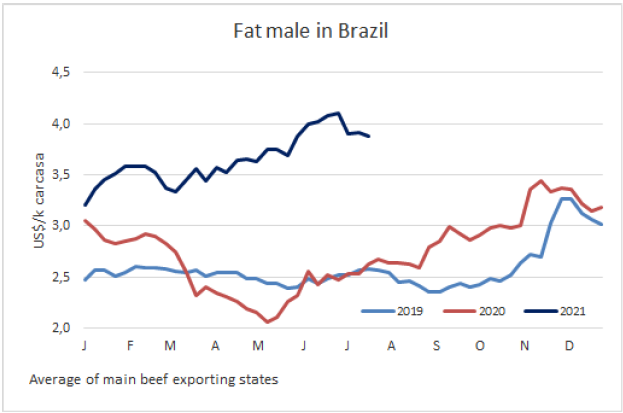 今年下半年巴西畜牧業(yè)機構(gòu)把焦點對準(zhǔn)畜牧業(yè)生產(chǎn)。根據(jù)Cepea研究人員的說法,與去年一樣,架子牛價格高和育肥成本高引起來養(yǎng)牛者的擔(dān)憂。Cepea的數(shù)據(jù)顯示,2021年生產(chǎn)者的利潤率確實比去年收緊,但扔保持正盈利。研究人員參考S?o Paulo州目前的待育肥牛和玉米價格以及10月份的牛期貨合約價格以計算今年的利潤率。