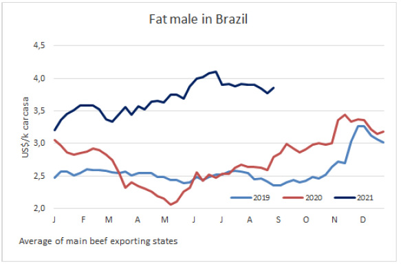 昨日,實施3個月的牛肉出口限制于當天到期,但政府不顧過去幾周的抗議、警告,決定將該限制延長2個月。因此,除關稅配額(希爾頓和481年歐盟、美國配額)和出口至以色列的每月3500噸,限制出口量不超過去年下半年平均值的50%的政策將被延期至10月31日。目前,7月和6月的出口量較5月低45%,較去年同期低三分之一。政府證證實了限制政策延期,生產者發(fā)起罷工。生產發(fā)展部的消息人士解釋了決定繼續(xù)限制出口的原因:“牛肉出口遠高于歷史平均水平。今年7月,牛肉出口額達1.94億美元,雖然這一數(shù)字較2020年7月下降了16%,但和2019年7月相比,仍高于歷史平均水平。2021年7月,巴西的牛肉出口“比2018年7月高11%,比2017年7月高71%,比2016年7月高135%,比2015年7月高172%”。同時政府聯(lián)絡委員會宣布,該政策讓生產商更加不安,他們可能會決定采取停產措施,盡管他們沒有具體說明日期或期限。