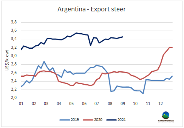 七月南美牛肉產品平均離岸價格5457美元/噸,達2011年11月至今十年以來最高。與去年七月相比,平均價格上漲了1285美元/噸,上漲了31%。今年前七個月南美國家牛肉出口平均價格4832美元/噸,較2020年的4492美元/噸上漲了8%。南美四國牛肉供不應求,價格強勁上漲。其中價格上漲最明顯的是實行出口限制的阿根廷,部分原因是配額產品的出口占比增大,配額產品平均價格較高。當然還有政府管控后“地下合同”減少的原因。四月阿根廷平均出口價格4072美元/噸,是南美地區(qū)最低,七月阿根廷平均出口價格達5389美元/噸,三個月內增長了32%。同期內,烏拉圭牛肉價格上漲了11%,巴西牛肉價格上漲了14%,巴拉圭價格上漲了15%,烏拉圭仍然是南美牛肉價格最高的國家,七月平均價格達5891美元/噸。