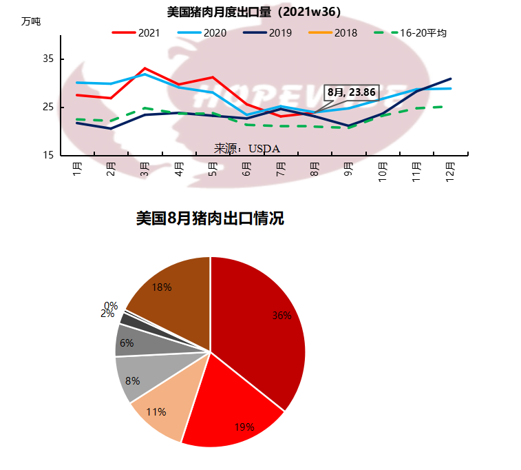 美國8月豬肉出口23.85萬噸,環(huán)比增加3.48%,同比減少0.25%。其中,出口墨西哥8.52萬噸,環(huán)比增加21.27%,同比增加50.41%,占8月美國豬肉出口總量的35.72%。墨西哥的后腿需求十分強勁。出口中國2.61萬噸,環(huán)比減少2.04%,同比減少49.23%,占比11%。中國本地豬肉鮮品價格便宜,凍品進口需求持續(xù)疲軟,是出口中國下降的主要原因。出口日本4.60萬噸,環(huán)比增加3.04%,同比增加8.83%,占比19%。日本超過中國,成為美國豬肉出口第二大國。出口韓國1.34萬噸,環(huán)比減少26.13%,同比增加5.40%,占比6%。