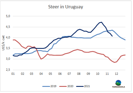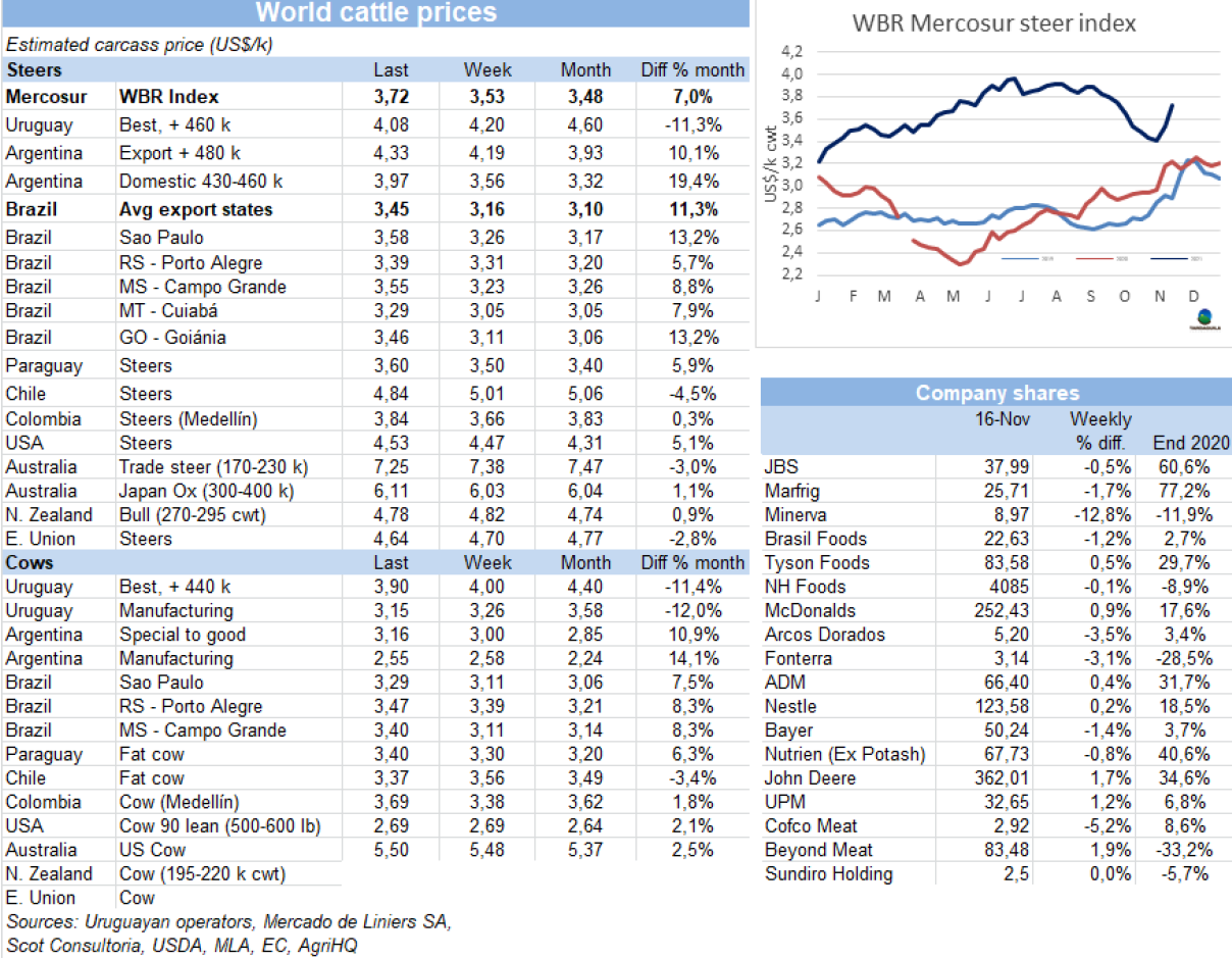 本周隨著巴西國(guó)內(nèi)市場(chǎng)需求對(duì)巴西育肥牛價(jià)格產(chǎn)生的積極作用,以及阿根廷和巴拉圭牛價(jià)上漲,南方共同市場(chǎng)閹牛價(jià)格指數(shù)反彈,較上周上漲19美分至3.72美元/公斤,達(dá)九月末以來(lái)最高。由于巴西國(guó)內(nèi)需求的改善和育肥牛供應(yīng)的減少,巴西主要出口州育肥牛價(jià)格在一周內(nèi)上漲了29美分,達(dá)3.45美元/公斤。南美地區(qū)牛價(jià)還受到阿根廷和巴拉圭的拉動(dòng),阿根廷的供不應(yīng)求導(dǎo)致活牛參考價(jià)上漲14美分至4.33美元/公斤,使阿根廷的牛價(jià)上漲至南美地區(qū)最高。巴拉圭方面對(duì)以色列的出口需求和降雨的到來(lái)使牛價(jià)從上周的下行開(kāi)始有所回升,唯一一個(gè)牛價(jià)下行的國(guó)家是烏拉圭,上周由于工會(huì)罷工,草飼牛需求有所緩解,參考價(jià)約達(dá)4.08美元/公斤。