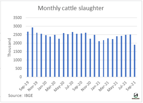 巴西地理統(tǒng)計(jì)研究所(IBGE)的調(diào)查顯示,2021年第三季度,巴西衛(wèi)生檢疫機(jī)構(gòu)注冊(cè)的屠宰場(chǎng)牛屠宰量達(dá)691萬(wàn)頭。與2020年第三季度相比下降了11.1%,與2021年第二季度相比下降了2.4%。屠宰量的下降主要發(fā)生在9月份,當(dāng)時(shí)對(duì)中國(guó)的出口暫停,導(dǎo)致出口工廠的需求急劇下降。當(dāng)月牛屠宰量191萬(wàn)頭,是自2004年3月(17年前)以來(lái)的最低月屠宰量。2021年第三季度牛肉產(chǎn)量(胴體重量)188萬(wàn)噸,較2020年同季度下降了9.4%,較今年第二季度下降了0.4%,平均胴體重量的增長(zhǎng)部分抵消了屠宰量的下降。今年第三季度待宰牛均重272公斤,較去年同期增長(zhǎng)了5.2公斤。