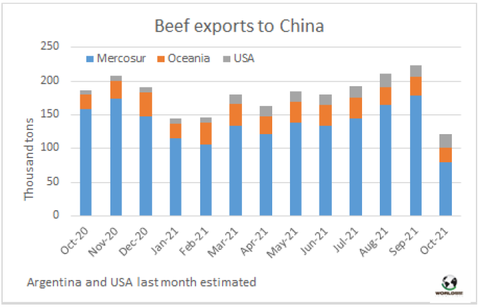 歐洲迎來(lái)了第四波新冠疫情后,各國(guó)政府采取的不同的措施使出口市場(chǎng)非常悲觀,持續(xù)至十月中旬的上漲趨勢(shì)結(jié)束。阿根廷方面的消息人士稱希爾頓配額產(chǎn)品很難賣,因?yàn)橐恍┛蛻粼谛乱徊ㄒ咔榈絹?lái)時(shí)不愿意采購(gòu),因?yàn)槭掷镉幸恍?kù)存,加上即將到港的敞口,他們認(rèn)為不需要更多了。另一位經(jīng)理人稱甚至有一些取消合同的情況,阿根廷臀腰肉價(jià)格下跌到13000美元/噸,現(xiàn)在還有更低一檔的參考價(jià),12500-12700美元/噸,今年年底市場(chǎng)會(huì)好轉(zhuǎn)的希望渺茫。
