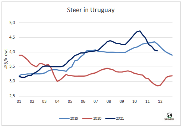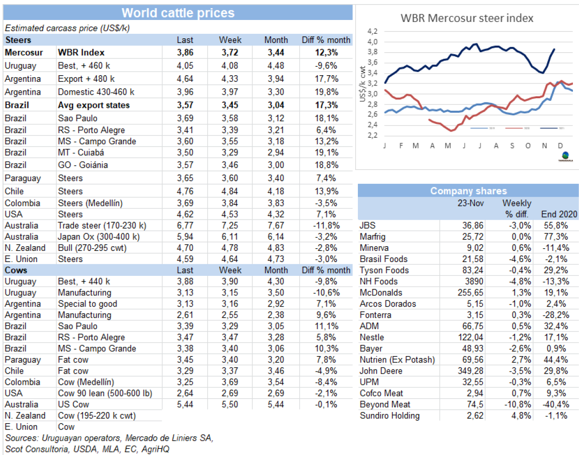 本周南方共同市場(chǎng)閹牛價(jià)格指數(shù)再次強(qiáng)勁上漲,達(dá)3.86美元/公斤,較上周上漲了14美分,達(dá)九月初以來(lái)最高水平。本周的上漲主要受到巴西和阿根廷牛價(jià)上漲的支撐,阿根廷育肥閹牛價(jià)格上漲至南美地區(qū)最高水平,本周參考價(jià)4.64美元/公斤,較上周上漲了31美分,較十月中旬累計(jì)上漲了87美元/公斤。巴西牛價(jià)繼續(xù)強(qiáng)勁恢復(fù),但仍未南美地區(qū)牛價(jià)最低的國(guó)家,盡管巴西雷亞爾貶值2.1%。巴拉圭牛價(jià)繼續(xù)上漲,本周上漲了5美分至3.65美元/公斤。烏拉圭方面情況相反,盡管牛價(jià)急劇下行的趨勢(shì)已經(jīng)結(jié)束,但特種閹牛價(jià)格在4.05美元/公斤上下波動(dòng)。