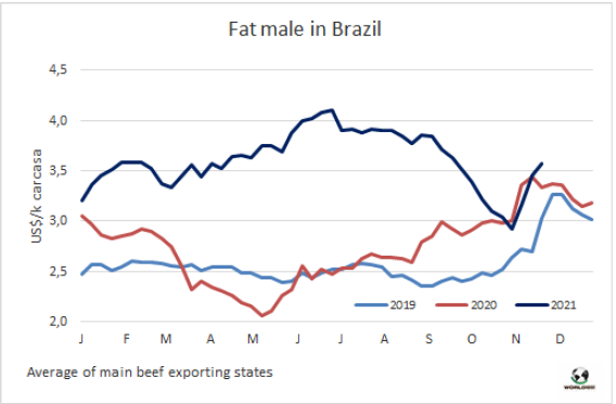 9-10月受對(duì)中國(guó)出口暫停影響育肥牛價(jià)格急劇下降,本周牛價(jià)有所恢復(fù)。根據(jù)應(yīng)用經(jīng)濟(jì)學(xué)高級(jí)研究中心的數(shù)據(jù),雖然中國(guó)對(duì)巴西牛肉的禁運(yùn)仍未取消,但截至11月17日,圣保羅育肥牛價(jià)格上漲了18.6%,達(dá)304.80雷亞爾/15公斤,本周大多數(shù)成交價(jià)320雷亞爾/15公斤。Cepea的研究人員稱,雨季有利于牧草漲勢(shì),農(nóng)民選擇壓欄。10月29日,育肥牛成交價(jià)為257.10雷亞爾/15公斤,較9月3日下跌了16%,9月3日是向中國(guó)市場(chǎng)出口中斷前的最后一天。昨天巴西主要出口州育肥牛均價(jià)281.5雷亞爾/15公斤,較上周上漲了14雷亞爾/15公斤,較三周前上漲了40雷亞爾/15公斤,漲幅達(dá)17%。預(yù)計(jì)昨天中國(guó)接受9月4日前取得衛(wèi)生證的產(chǎn)品申報(bào)的消息發(fā)布后,市場(chǎng)將有樂觀轉(zhuǎn)變,活牛市場(chǎng)和牛肉批發(fā)市場(chǎng)的上行趨勢(shì)將有所持續(xù)。