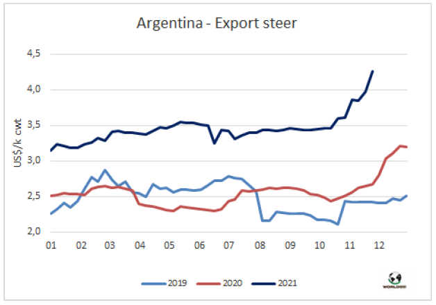 上周活牛價(jià)格保持上漲趨勢(shì),本周出口閹牛價(jià)格上漲了20-30比索/公斤,質(zhì)量最好的英國(guó)純種閹牛參考價(jià)410-430比索/公斤,澤布雜交牛價(jià)參考價(jià)400-420美元/公斤,質(zhì)量最好的母牛價(jià)格上漲了20比索至340-350比索/公斤,工業(yè)母牛參考價(jià)上漲了15比索至290-300比索/公斤。僅上個(gè)月出口閹牛的比索價(jià)格上漲了18%-20%,特優(yōu)母牛價(jià)格上漲了17%,工業(yè)母牛價(jià)格上漲了13%。其主要原因是日益增長(zhǎng)的出口需求(每月3500噸猶太潔食屠宰配額和希爾頓部位肉的屠宰計(jì)劃更好的整合,加上481配額的預(yù)期發(fā)貨和向中國(guó)出口的5000噸母牛產(chǎn)品配額),盡管在通貨膨脹嚴(yán)重的背景下出口帶來(lái)的價(jià)值略有延遲。