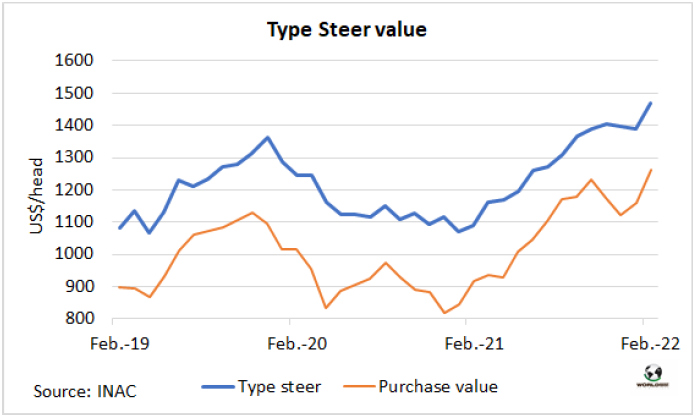 INAC把一頭體重480公斤,出成率54%的牛的銷售價值成為閹牛類型價值,2月該指數(shù)達(dá)到了歷史新高1470美元,較上月增加81美元。INAC表示,環(huán)比的增長是由于“出口部位肉和到國內(nèi)市場的東西銷售價值增長,部分抵消了內(nèi)臟和副產(chǎn)品價值的下降,而鮮皮的價格保持穩(wěn)定?!北驹禄钆2少弮r格上漲了105美元,達(dá)1264美元,因此工業(yè)增加值(兩者之間的差額)收縮至206美元/頭,僅為閹牛類型價值的14%。