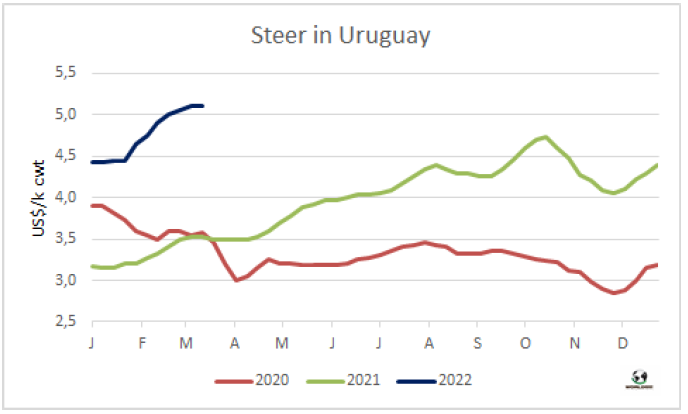 上周屠宰量受到24小時罷工影響。烏拉圭肉協(xié)統(tǒng)計(jì)截止3月12日當(dāng)周牛屠宰量51784頭,盡管屠宰量仍高于五萬頭,但較上周有10%的降幅,是今年以來首次屠宰量同比下降。閹牛屠宰量下降最為顯著,較上周下降了3715頭至25258頭。小母牛屠宰量下降了1645頭至5908頭,母牛屠宰量僅較上周下降了692頭至19327頭。屠宰活動最活躍的工廠是Las Piedras(379廠),屠宰量4894頭,Minerva Pulsa(7廠) 屠宰量3925頭, 其次是Minerva Canelones(8廠)屠宰量3892頭。Marfrig四家屠宰廠屠宰量12424頭,較上周下降了2920頭,美麗華三家屠宰場屠宰量11237頭,較上周減少了288頭。3月前12個工作日牛屠宰量共計(jì)99980頭,較2021年同期減少了0.4%,主要是閹牛屠宰量減少了5.3%,小母牛屠宰量減少了11.2%,母牛屠宰量增加了10.2%,閹牛中只有2-4顆齒閹牛屠宰量增長了7.1%。