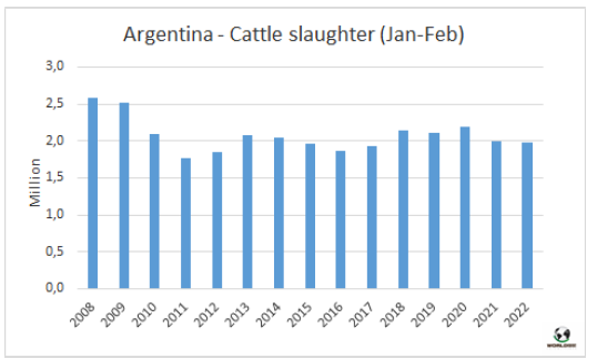 據(jù)農(nóng)業(yè)部估算,今年2月阿根廷牛肉產(chǎn)量23.2萬噸,2022年前兩個月產(chǎn)量合計(jì)45.4萬噸。單月看有所差異,但1-2月合計(jì)牛肉生產(chǎn)量與去年同期持平。2月人均消費(fèi)量51公斤,1-月人均消費(fèi)量48公斤,比2021年同期增長8%。