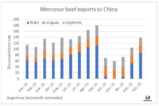 今年2月,南方共同市場國家向中國出口了近14萬噸的牛肉,環(huán)比增加3.4萬噸,同比也有所增加,這是自去年9月以來從未出現(xiàn)過的情況。這一增長是由于來自巴西的銷售強(qiáng)勁擴(kuò)張,在12月15日重新開放后,巴西已經(jīng)恢復(fù)了發(fā)貨速度。巴西2月的出口量為8.7萬噸(比1月份多3.4萬噸),而烏拉圭的出口量仍在2.5萬噸左右。據(jù)估計(jì),阿根廷的出口量在2.7萬噸上下擺動,與1月的出口量相當(dāng)。2月從南方共同市場運(yùn)出的這些貨物將在3月中旬至4月下半月抵達(dá)目的地。南方共同市場占中國進(jìn)口牛肉供應(yīng)的75%。今年2月從澳洲進(jìn)口量27,265噸 (新西蘭15,734噸,澳大利亞11,531噸)。另一個重要的供應(yīng)國是美國,1月美國出貨量為16156噸,目前還沒有2月的數(shù)據(jù)。