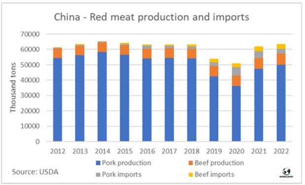 今年中國紅肉的生產(chǎn)和進(jìn)口將達(dá)到非洲豬瘟(ASF)疫情之前的水平,非洲豬瘟從2018年下半年開始摧毀了中國的生豬存欄。根據(jù)美國農(nóng)業(yè)部駐北京辦公室發(fā)布的預(yù)測,今年豬肉和牛肉的生產(chǎn)和進(jìn)口總額將達(dá)到6355萬噸,比2021年多170萬噸,與豬瘟出現(xiàn)之前的2016-2017年水平相似。美國農(nóng)業(yè)部辦公室預(yù)計(jì),今年的豬肉產(chǎn)量將增加250萬噸,達(dá)到5,000萬噸。就中國而言,豬肉進(jìn)口每年將大幅下降24%至330萬噸;無論如何,這一產(chǎn)量是2017年和2018年的兩倍多,當(dāng)時的產(chǎn)量為150萬噸。豬肉進(jìn)口量下降是由于豬肉產(chǎn)品的國內(nèi)價格下降,考慮到今年中國經(jīng)濟(jì)適度增長,進(jìn)口關(guān)稅提高至12%。牛肉方面,國內(nèi)產(chǎn)量預(yù)計(jì)增長2.4%,達(dá)到715萬噸,進(jìn)口量將溫和增長2.5%(遠(yuǎn)低于往年),相當(dāng)于7.6萬噸胴體重,達(dá)310萬噸。美國農(nóng)業(yè)部此前的預(yù)測是,今年中國牛肉進(jìn)口量為325萬噸。