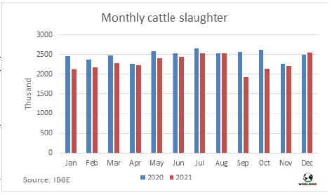 根據(jù)巴西地理和統(tǒng)計研究所(IBGE)的數(shù)據(jù),巴西活牛生產(chǎn)商2021年屠宰了2754萬頭牛,比前一年下降了7.8%。IBGE在一份報告中表示:“這一結果反映出牛屠宰量連續(xù)第二年下降,延續(xù)了自2020年初以來觀察到的保留存欄情況?!迸c去年同期相比,唯一一個屠宰量增加的月份是12月,增加了4萬頭,而降幅最大的是9月,減少了65.1萬頭,由于馬托格羅索州和米納斯吉拉斯州出現(xiàn)了非典型的瘋牛病病例,出口禁運。犢牛平均價格創(chuàng)紀錄的上漲刺激了母牛的保留存欄。2021年全年母牛屠宰的量931萬頭,是自2004年以來的最低記錄?!?今的年牛屠宰數(shù)量較2020年減少了234萬頭,27個州中23個州屠宰量都有減少。馬托格羅索州屠宰量下降最為顯著,下降了633.91萬頭。南馬托格羅索州屠宰量減少了43.89萬頭。2021年馬托格羅索州仍以16.2%的占比保持屠宰量領先地位,其次是戈亞斯州(占比10.8%)和南馬托格羅索州(占比10.7%)。2021年第四季度,衛(wèi)生檢查機構注冊下的屠宰廠屠宰量約690萬頭,較2020年第四季度下降了6.4%,達2008年以來最低。與2021年第三季度相比,屠宰量下降了0.9%。