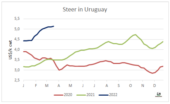 盡管上周牛肉出口速度有所下降,但3月有望成為歷史上巴西牛肉出口量最高的月份。如果在本月剩下的時間里保持這一勢頭,巴西的出口量將超過去年9月(18.7萬噸)的最大值,接近20萬噸。3月的前19天,巴西出口了121028噸牛肉,平均價格為5894美元/噸。這比2021年3月的出口量高出60%,而平均價格較上年增長27.8%。