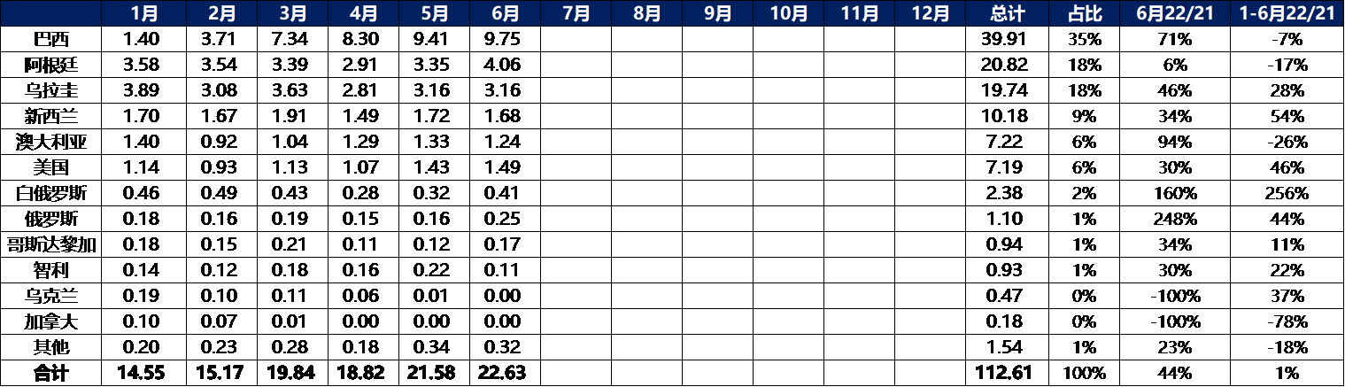 2022年6月中國(guó)主港牛肉進(jìn)口量22.63萬(wàn)噸,環(huán)比+4.9%,同比+44%。1-6月中國(guó)主港牛肉累計(jì)進(jìn)口量112.61萬(wàn)噸,與去年同期相比+1%。從進(jìn)口國(guó)別看,巴西仍然是最大進(jìn)口來源國(guó),從巴西進(jìn)口量占比達(dá)35%,前五大進(jìn)口來源國(guó)為巴西、阿根廷、烏拉圭、新西蘭、澳大利亞。