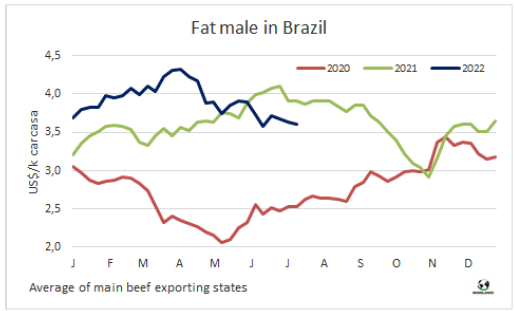 Cepea數(shù)據(jù)顯示,今年1-6月?tīng)倥?span>(在南馬托格羅索州出售的8-12個(gè)月)的平均體重為213.15公斤/頭。從Cepea于2000年2月開(kāi)始這項(xiàng)調(diào)查以來(lái)的年平均數(shù)據(jù)來(lái)看,這一數(shù)據(jù)創(chuàng)歷史新高。情況表明,盡管生產(chǎn)成本很高,但巴西農(nóng)民近年來(lái)增加了改善養(yǎng)殖技術(shù)方面的投資。養(yǎng)殖的改善已經(jīng)可以通過(guò)架子牛供應(yīng)的增加以及犢牛體重增長(zhǎng)觀察到。