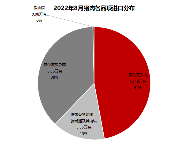從8月豬肉進(jìn)口品項(xiàng)看,其他凍豬肉和其他凍豬雜碎的進(jìn)口量之和占豬肉進(jìn)口量的85%。豬主塊肉類(lèi)和豬脂肪類(lèi)進(jìn)口量占比較7月變化不大。