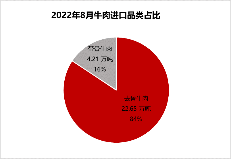 從牛肉進(jìn)口品項(xiàng)看,帶骨牛肉占比基本沒(méi)有變化。8月去骨牛肉進(jìn)口量22.65噸,占84%,帶骨牛肉進(jìn)口量4.21萬(wàn)噸,占16%。